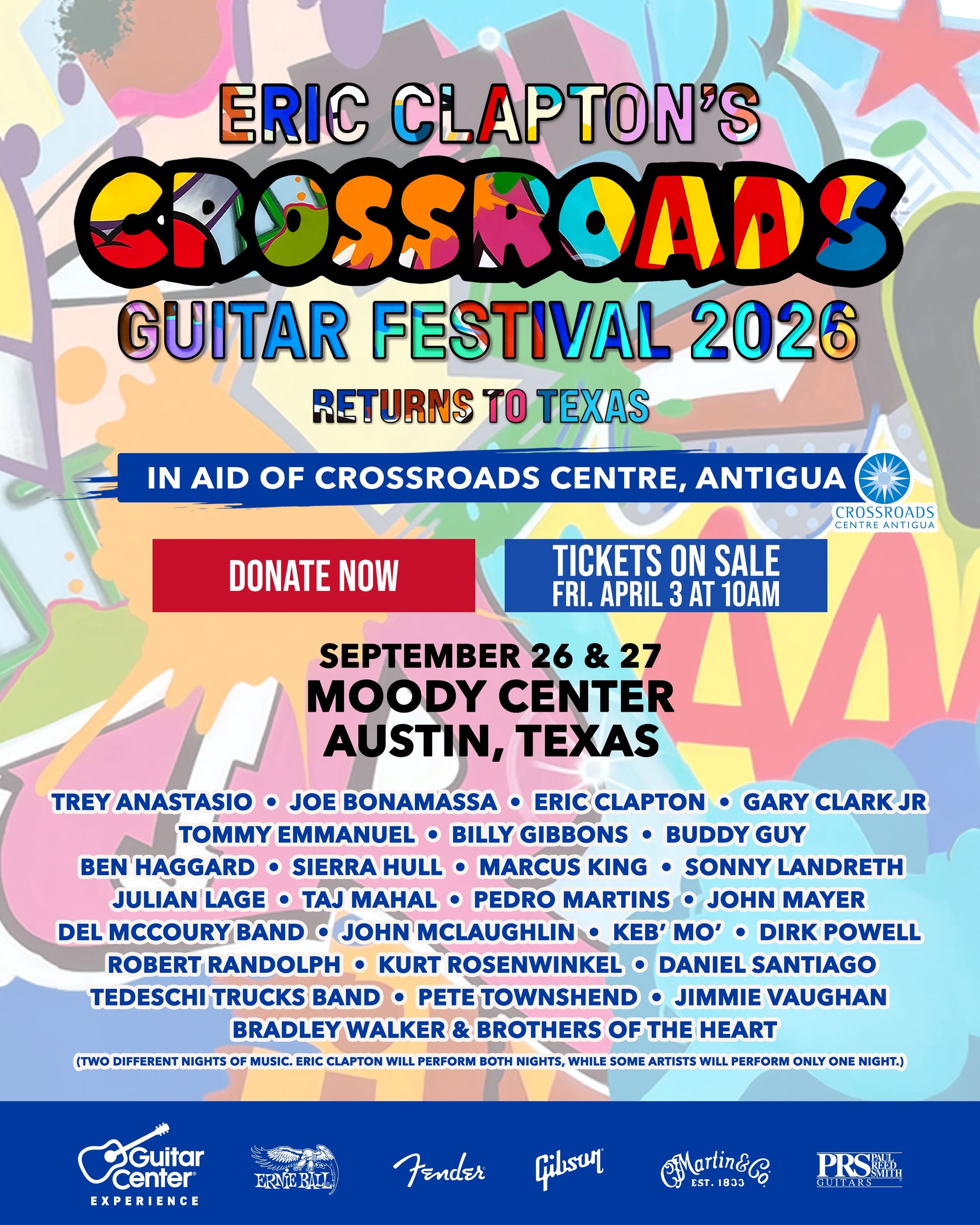 Eric Clapton’s Crossroads Guitar Festival 2026 returns to Texas, taking place September 26-27 in Austin, Texas at Moody Center. It will be his seventh festival and is being held in celebration of the 28th anniversary of the 1998 founding of the Crossroads Centre Antigua.